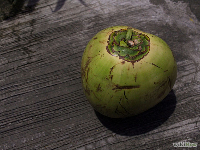 - Inserta con poca profundidad un cuchillo o machete en el extremo donde está el tallo. Este primer corte tiene dos propósitos: Primero, prepara un área limpia para tus labios: libre de desechos de pájaros, residuos de humo de diesel que les cae al transportarlos y otros contaminantes. Segundo, como algunas cascaras son muy gruesas para atravesarlas fácilmente con un solo corte: hacer un corte transversal hará que el próximo agujero sea más sencillo.