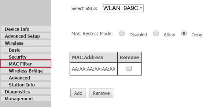 Si lo que quieres es hacer un filtrado MAC para que sólo las direcciones MAC que tú desees puedan conectarse a través de tu red, se puede hacer de la siguiente manera.