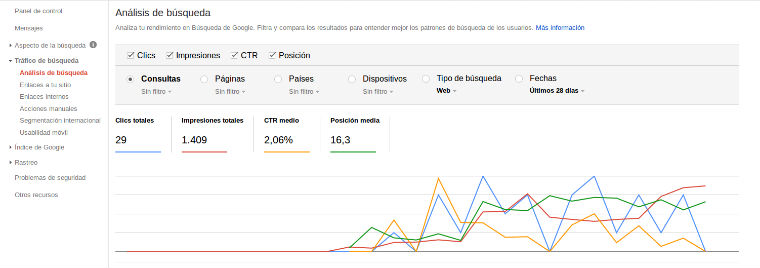 Uno de los más interesantes es el “Análisis de búsqueda”, que encontrarás en la pestaña “Tráfico de búsqueda”. Te enseñará un gráfico con los clics totales, las impresiones, el CTR y la posición que ocupa tu página en Google para esa palabra clave. El gráfico te muestra la evolución a lo largo del tiempo en cada uno de estos aspectos.